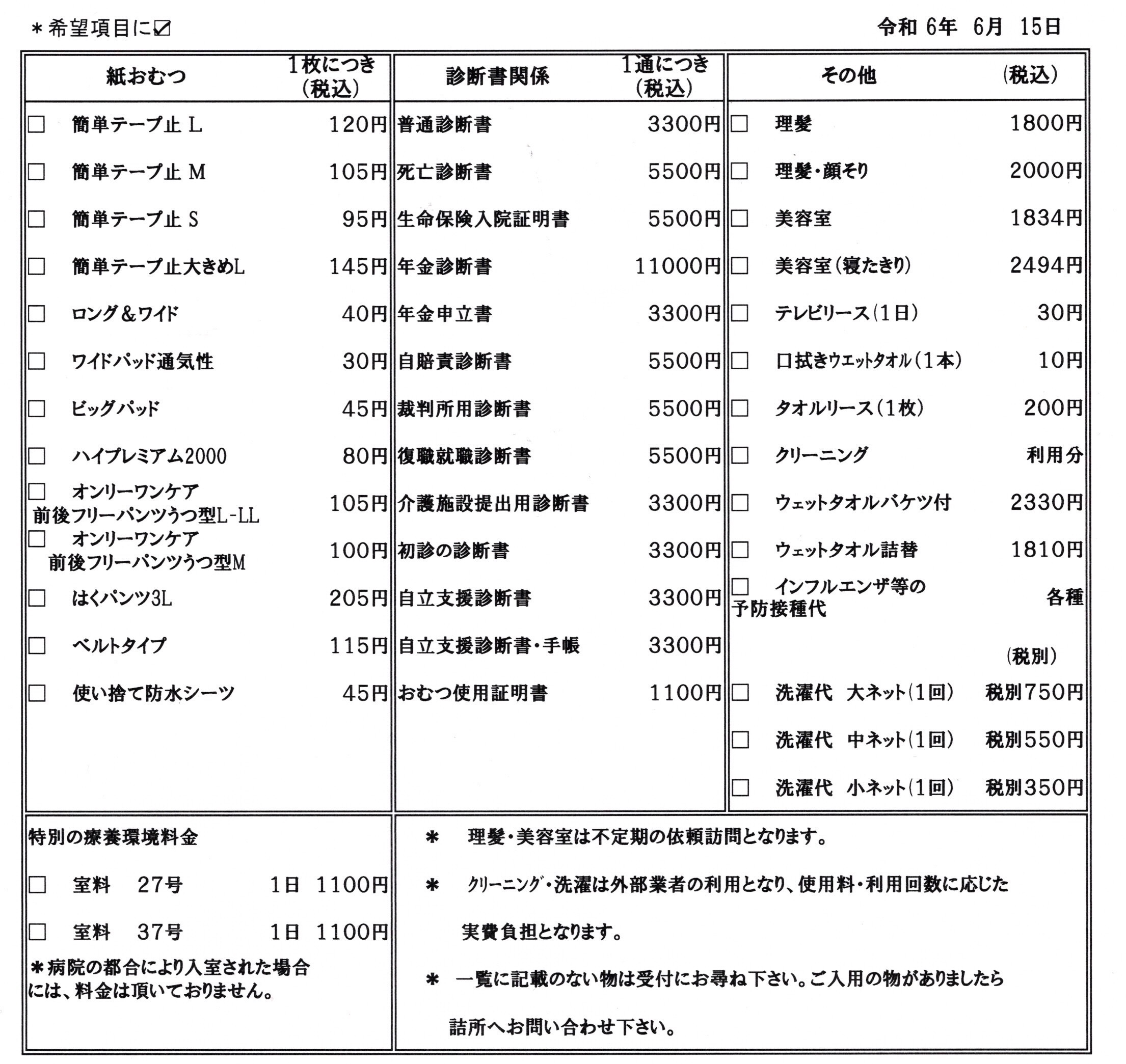 当院では個室使用料、紙おむつ代、タオルリース代、洗濯代、ウエットタオル、証明書、診断書料等につきましては、その利用日数、利用回数に応じた実費の御負担をお願いしております。詳細はこちら